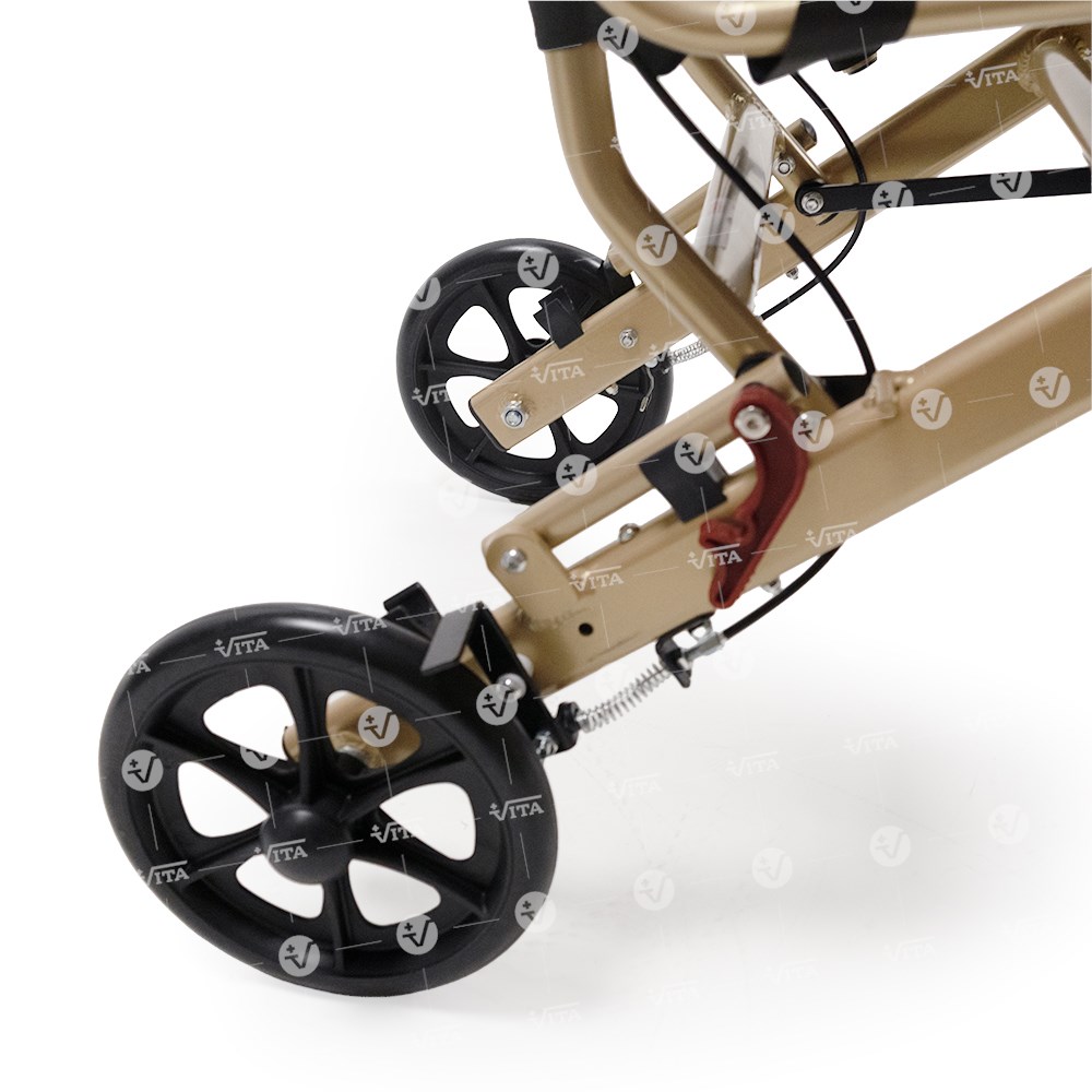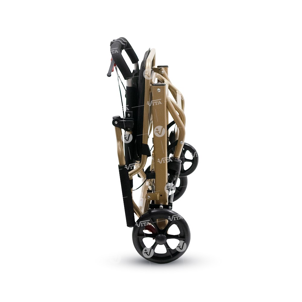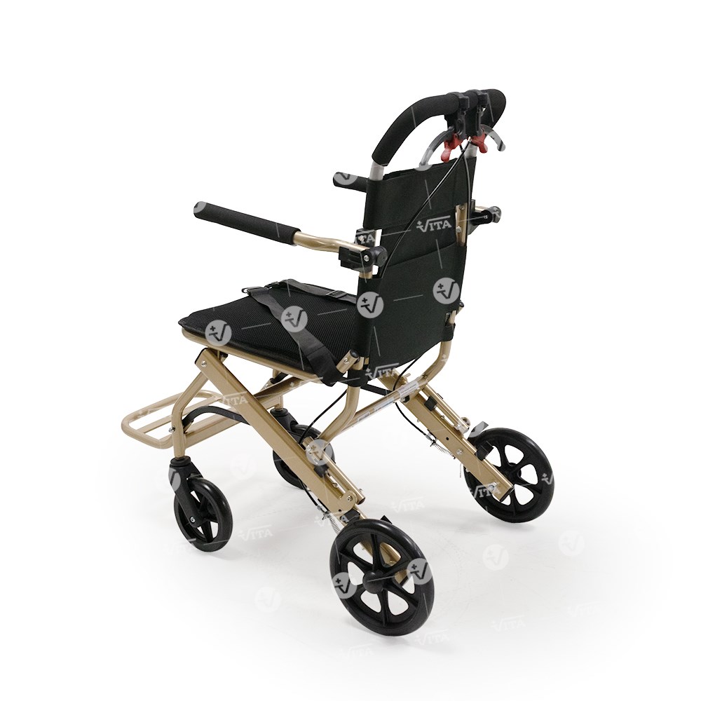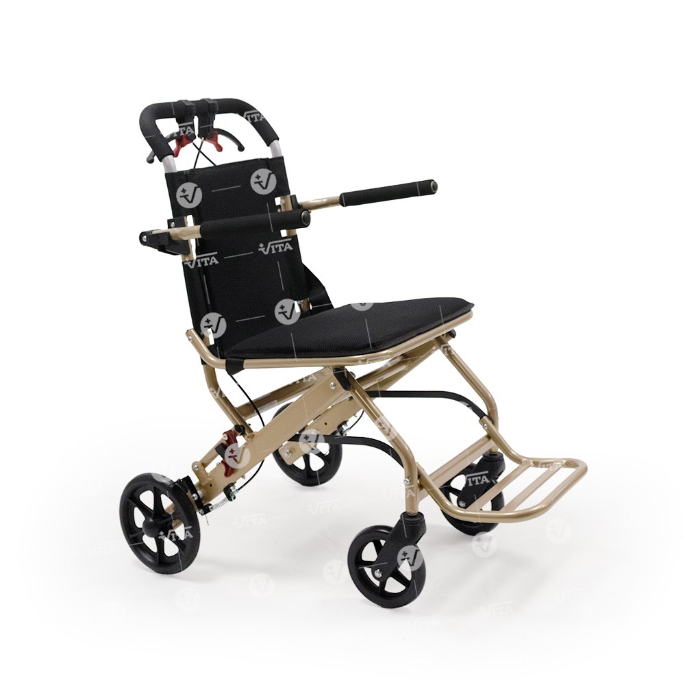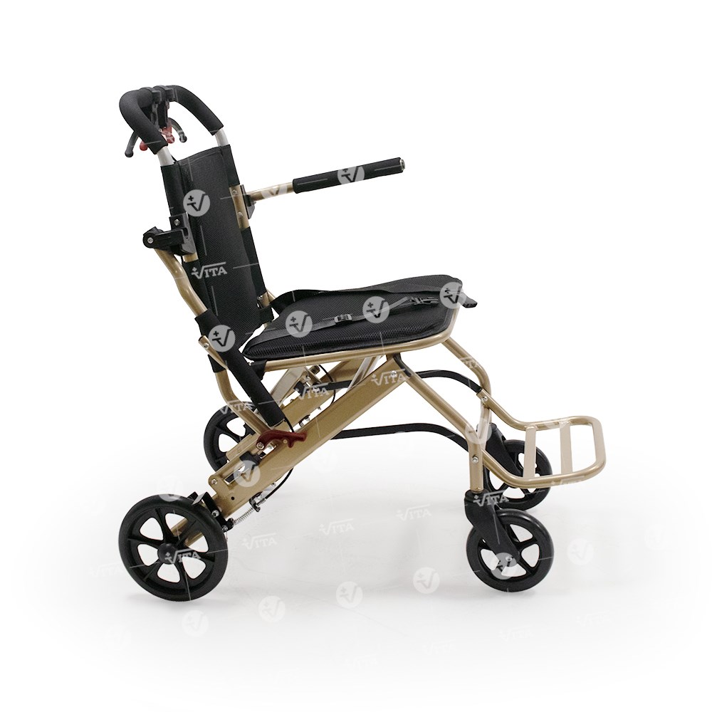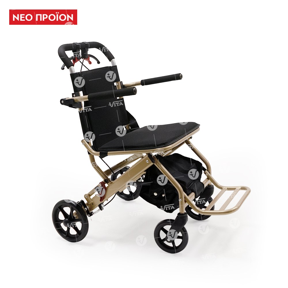 Πτυσσόμενο αμαξίδιο μεταφοράς από αλουμινίο. Ιδανικό για χρήση σε αεροπλάνο, ταξίδι, νοσοκομείο και για οικιακή χρήση. Πλαϊνά στηρίγματα τύπου "flip-up". Υποπόδιο αναδιπλούμενο, σύστημα φρένων συνοδού και ζώνη ασφαλείας. Επένδυση καθίσματος και πλάτης από αεριζόμενο μαλακό υλικό. Εργονομικός σχεδιασμός για εύκολη αποθήκευση και μεταφορά. Διαθέτει προσθαφαιρούμενο σάκο αποσκευών κάτω από το κάθισμα.
