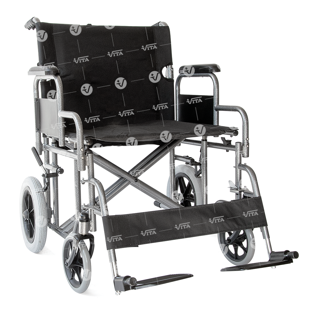 Bariatric wheelchair, folding, with metal frame with electrostatic paint (powder coated). Reinforced with double scissors for greater strength and stability. Removable sides and footrests. Folding backrest for easy transfer and storage. Foldable push bar with safety mechanism.